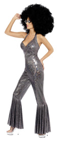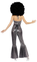 Hopeanvärinen diskohaalari. Vartalonmyötäinen hieman läpikuultava kangas. Haalareiden yläosa solmitaan niskan takaa ja vyötäröllä on kiristysnauhat. Haalarin selkä on avoin. Lahkeet ovat todella leveät 70-luvun tyyliin.