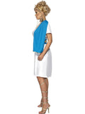 Asukokonaisuuteen kuuluu sini-valkoinen polvipituinen toogamekko, vyö sekä kullanvärinen laakerinlehtiseppele.