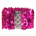 Pinkki joustava (stretch) vyö paljeteilla, pituus 60 cm. Vyö on noin 5 cm leveä ja siinä on metallinen solki.