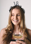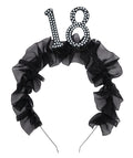 Headband with a black fabric ruffle and the number decorated with pearls. Overall size approximately 12 x 19.5 cm. Height of the number itself approximately 5.3 cm