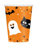 Hauskat ja värikkäät Halloween pahvimukit tuovat juhlapöytään heti oikean tunnelman! Pakkaus sisältää 6 kappaletta oranssipohjaisia 250 ml mukia, joita koristavat iloinen kummitus, musta kissa, lepakko ja tähtikuviot. Sopivat täydellisesti Halloween-juhliin, lasten naamiaisiin tai teemabileisiin. Mukit ovat kertakäyttöisiä, joten niiden avulla siivous helpottuu ja juhlat sujuvat vaivattomammin. Yhdistä muihin Halloween-teemaisiin astioihin ja koristeisiin, niin saat kattauksen näyttämään yhtenäiseltä ja juhlavalta.