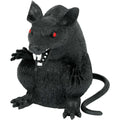 Kauhistuttava muovinen rotta pöydälle koristeeksi. Punaiset silmät ja valkoiset etuhampaat.
