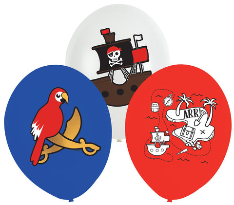 Värisekoitus sinisiä, punaisia ja valkoisia ilmapalloja merirosvoteemaan sopivilla painatuksilla. Kumipallot voidaan täyttää Helium-ilmapallokaasulla tai ilmalla ilmapallopumpulla.
