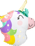 Yksisarvisen pää foliopallo. Täytetyn pallon koko on noin 40 x 53 cm.