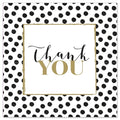 Mustavalkoinen kortti ripauksella kullanväriä. Kortissa teksti Thank you ja tekstin ympärillä mustapilkulliset kehykset. Kortti on sisältä tekstitön. Kortin koko on 7,5x7,5 cm. Kirjekuori sisältyy pakkaukseen.