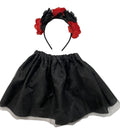 Setti sisältää mustan hameen ja pannan, jossa on punaisia ja mustia ruusuja.