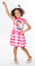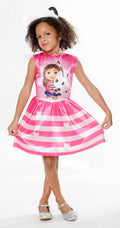 Kokonaisuuteen kuuluu mekko, jonka miehustassa iso Gabbyn ja Pandy Pawn kuva. Helman etupuoli raidallinen. Kokonaisuus täydentyy yhteensopivalla hiuspannalla.