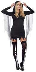 Näyttävä ja rohkea viikatemiehen mekko muuttaa klassisen kauhuhahmon vietteleväksi versioksi! Asuun kuuluu musta mekko, jossa siksak-reunainen helma ja huppu, joka tuo mystistä dramatiikkaa kokonaisuuteen. Asu sopii täydellisesti Halloween-juhliin ja naamiaisiin, kun haluat yhdistää pelottavan ja houkuttelevan tyylin. Helppo yhdistää esimerkiksi viikatteeseen tai muihin kauhuteemaisiin asusteisiin, joilla saat entistä vaikuttavamman lookin.