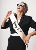 Paper sash Happy and number in cream color with black print, width approx. 9.5 cm, length approx. 76 cm. The set includes a black velvet ribbon to tie the sash.
