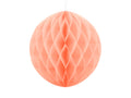 Vaalea persikka hunajakenno koriste, halkaisija 30 cm. Hunajakennon kolmiulotteinen muoto tuo tilaan pehmeää tunnelmaa. Materiaali 98 % kreppipaperi ja 2 % puuvilla. Ekologinen ja kevyt juhlakoriste.