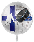 Suomen lipulla varustettu jääkiekkoaiheinen foliopallo.