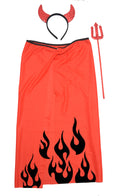 Settiin kuuluu pirunsarvipanta, hiilihanko ja punainen viitta, mustalla liekkikuviolla. Setti on lasten kokoa.