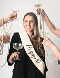 Paper sash Happy and number in cream color with black print, width approx. 9.5 cm, length approx. 76 cm. The set includes a black velvet ribbon to tie the sash.