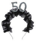Headband with a black fabric ruffle and the number decorated with pearls. Overall size approximately 12 x 19.5 cm. Height of the number itself approximately 5.3 cm