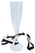 Muovinen shampanjalasi, jossa mustavalkoinen nauha.