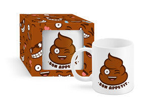 Valkoinen posliinimuki, silmää iskevän kakan kuvalla.