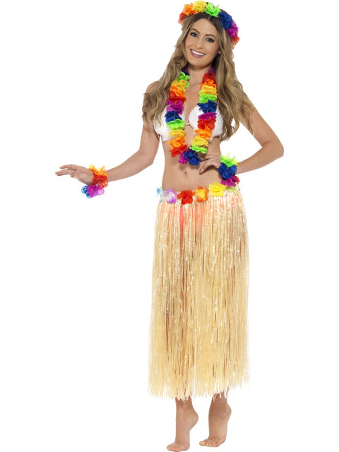Aikuisten naamiaisasuste-setti. Pakkaus sisältää kaulaan ripustettavan lei-koristeen ja kukkaseppele-tyyppisen pääkoristeen.