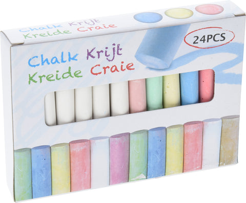 Pakkaus sisältää 12 valkoista ja 12 värillistä taululiitua. Laatikon koko on noin 12x2x8,5 cm.