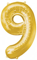 Kullanvärinen numerofolio 9. Voidaan täyttää ilmalla tai heliumilla. Pallossa ripustusaukko numeron yläosassa.