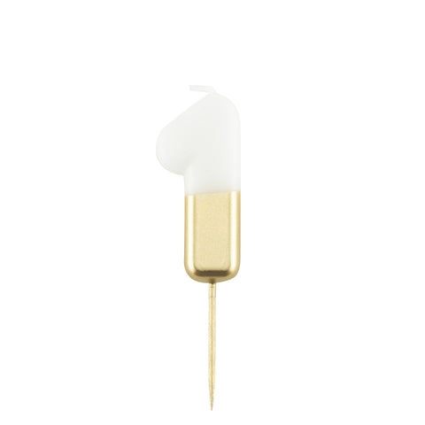 Valkoinen numeron 1 muotoinen kynttilä kultaisella koristuksella.