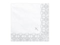 Valkoiset 3-kertaiset lautasliinat, joissa reunassa hopeanvärinen koristekuvio ja kulmassa pieni risti. Lautasliinojen koko on 33x33 cm.
