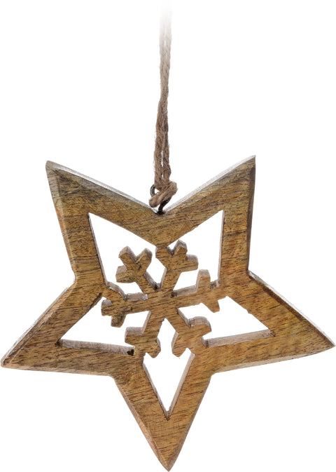 Puinen tähden muotoinen ripustettava koriste, jossa myös puinen lumihiutale keskellä. Koristeen halkaisija on noin 15 cm.